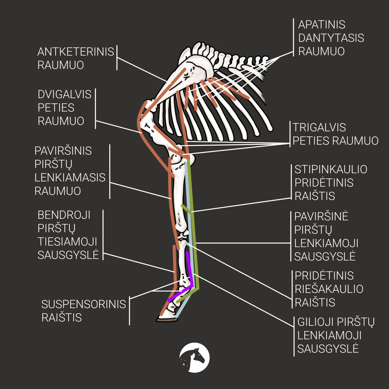 Stovėjimo metu žirgų kūną veikia 2 pagrindinės jėgos, einančios skirtingomis kryptymis. Pirmoji – žemės traukos jėga, kuri traukia kūno svorį žemyn nuo peties ar klubo ir žemės atatrankos jėga, kuri veikia galūnę nuo kanopos kryptimi į petį ar klubą. Tam, kad galūnės būtų išlaikytos tiesos ir nesulinktų veikiamos šių dviejų jėgų, ekstensoriniai (tiesiamieji) raumenys yra aktyvūs.