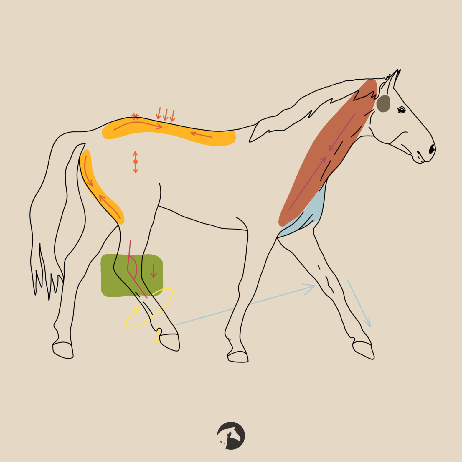 Šios kompensacijos rezultatas: asimetrija ir netolygus svorio paskirstymas, kuris galų gale matomas kanopose ir netolygiame jų nusidėvėjime. Taip pat sukeliama papildoma apkrova vidiniams kojų raumenims ir sausgyslėms, dėl ko atsiranda raumenų įtampa ir trigeriniai taškai. Ir visa tai vyksta tik dėl vienos skaudančios galūnės!